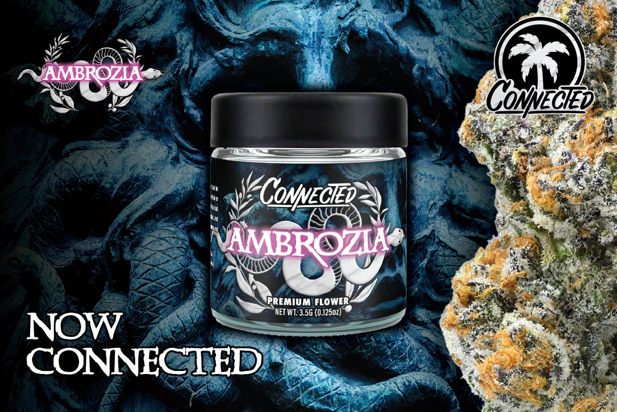 Ambrozia by Connected fuses Bad Apple and Zkittlez to deliver bold sweet candy and gassy tart fruit pie flavors with hints of pine and spice. Crack open a nug and you’ll be hit with a burst of sweet candy and tangy gas, balanced by subtle notes of pine and tart fruit pie. The buds are dense, sticky, and dripping in trichomes, flaunting deep greens, hints of purple, and a frosty layer that screams fire. These burn smooth with clean white ash, offering a silky smoke that hits just right.