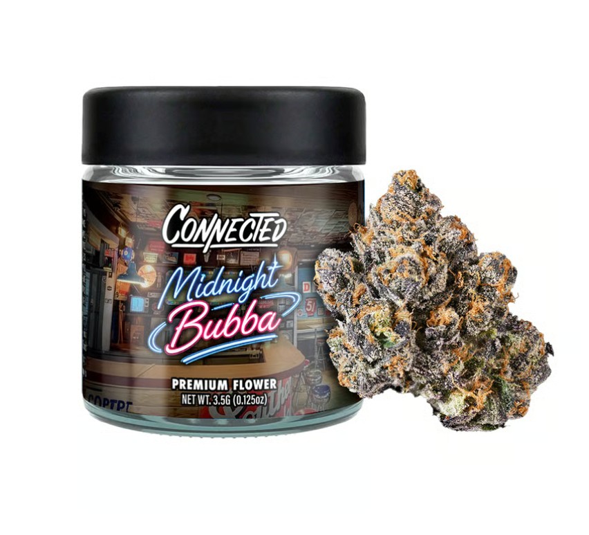 Midnight Bubba is a beautiful flower with deep violet and dark purple hues, accented by reddish-orange hairs woven through dense, frost-covered, crown-shaped buds. The aroma opens with a sharp pop of sour blueberries and hard candy, layered over a leathery, almost incense-like undertone. The flavor mirrors the aroma in reverse, starting with rich coffee, deep earth, and classic kush, then finishing with a lingering sour blueberry hard candy note that adds contrast and depth. Effects come on fast and heavy, making Midnight Bubba an ideal end-of-day strain. Expect deep physical relaxation and true couch-lock, paired with a long-lasting, blissful calm.