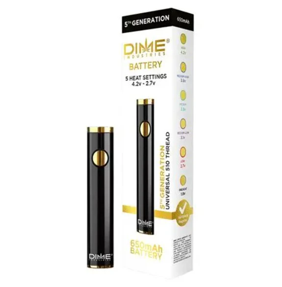Dime Industries’ 5th Generation Battery has upgraded to include 5 unique voltage settings and preheat function for all consistencies. Designed with a 510 thread that perfectly compliments our tanks, this 650mAh battery features an industry-leading technology that provides enough power to last all day, all week, or even all month for light users thru the USB-C charging port. This device has an ICU chip that offers a customizable heating curve that heats instantly. Additionally, it contains a proprietary smart-chip for flavor preservation to prevent overheating or burning. Every Dime Industries’ battery includes a rechargeable USB-C charging cord, while the packaging doubles as a sleek, convenient carrying case for device safety and cleanliness. • Longest lasting 4.2v high capacity battery • Most powerful & reliable 650mAh battery in the industry • Universal with all 510 thread cartridges • Turbo chip offers a custom heating curve and instantly heats up between 425°f to 480°f • Proprietary smart chip for flavor preservation and to prevent over burning • Operating the Device: 5 Clicks - Turn On/Off | 3 Clicks - Change Heat | 2 Clicks - Pre Heat • Five heat settings for different materials from 4.2v to 2.7v • USB-C Rechargeable with charging cord inside • Includes a carrying case for device safety and cleanliness