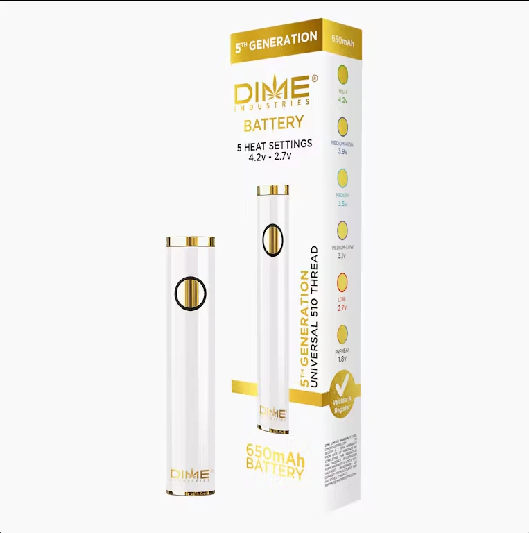 Dime Industries’ 5th Generation Battery has upgraded to include 5 unique voltage settings and preheat function for all consistencies. Designed with a 510 thread that perfectly compliments our tanks, this 650mAh battery features an industry-leading technology that provides enough power to last all day, all week, or even all month for light users thru the USB-C charging port. This device has an ICU chip that offers a customizable heating curve that heats instantly. Additionally, it contains a proprietary smart-chip for flavor preservation to prevent overheating or burning. Every Dime Industries’ battery includes a rechargeable USB-C charging cord, while the packaging doubles as a sleek, convenient carrying case for device safety and cleanliness. • Longest lasting 4.2v high capacity battery • Most powerful & reliable 650mAh battery in the industry • Universal with all 510 thread cartridges • Turbo chip offers a custom heating curve and instantly heats up between 425°f to 480°f • Proprietary smart chip for flavor preservation and to prevent over burning • Operating the Device: 5 Clicks - Turn On/Off | 3 Clicks - Change Heat | 2 Clicks - Pre Heat • Five heat settings for different materials from 4.2v to 2.7v • USB-C Rechargeable with charging cord inside • Includes a carrying case for device safety and cleanliness