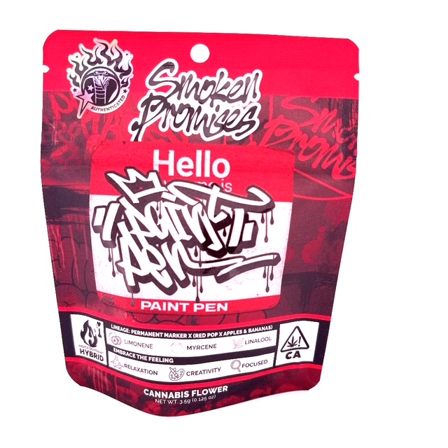 Smoken Promises' Paint Pen is an indica-dominant hybrid that lives in the creative sweet spot - relaxed enough to quiet the noise, focused enough to actually do something with the quiet. A cross of Permanent Marker and the Red Pop x Apples & Bananas combination, it stacks award-winning genetics into a strain built around one of the most sought-after effects combos in the market: relaxation, creativity, and focus at the same time.