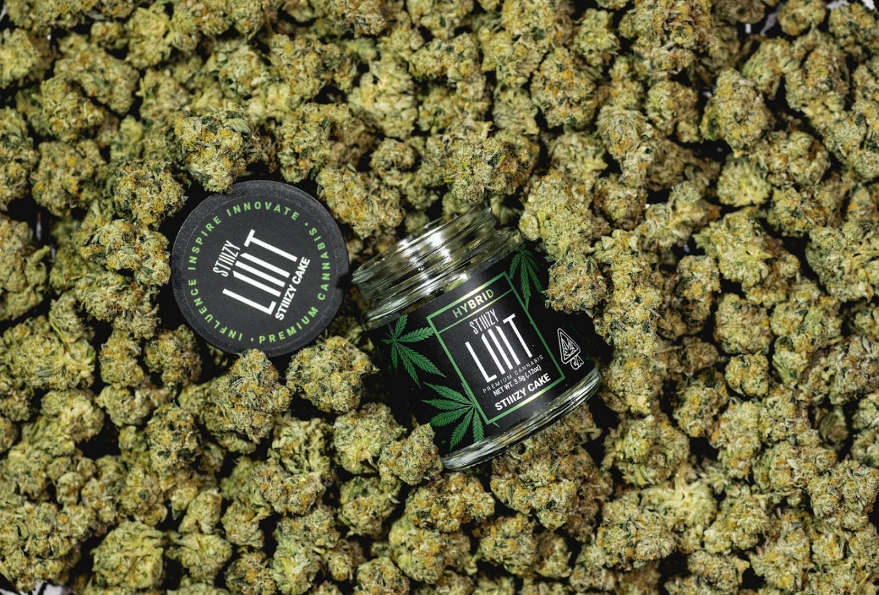 STIIIZY CAKE / HYBRID · Taste: Pine, Spicy, Earthy · Feeling: Calm, Happy, Euphoric · Description: This indica-dominant hybrid is a skunky, pungent strain that will put you bring you a sense of calm.